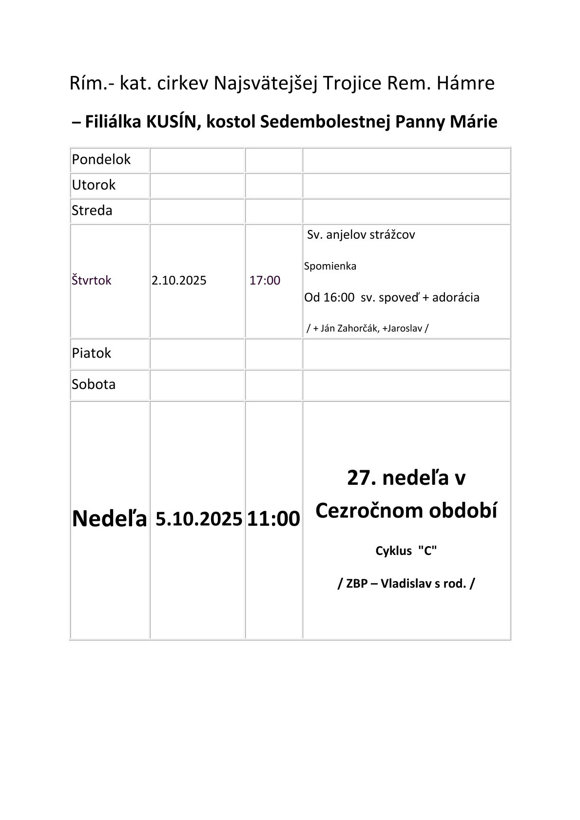 SOBOTA 4.10.2025 Sv. liturgia: 1630 hod. *Ružencové spoločenstvá
